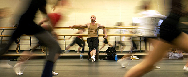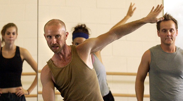 Patrick Corbin watches from across the studio as members of the University Dance Company rehearse at Robinson Hall. Corbin, who just wrapped up a celebrated 15-year stint with the Paul Taylor Dance Company in New York, taught the dancers his Loop