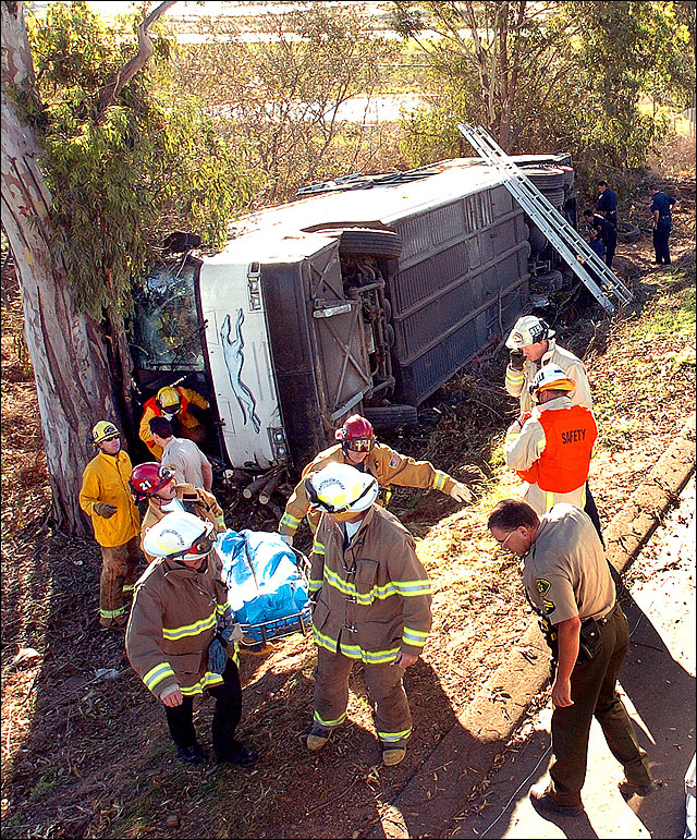 Seven other people suffered major injuries, four had moderate injuries, and 31 had minor injuries after the bus went down an embankment along Highway 101 in Santa Maria shortly after 7 a.m., said Santa Barbara County Fire Capt. Keith Cullom.