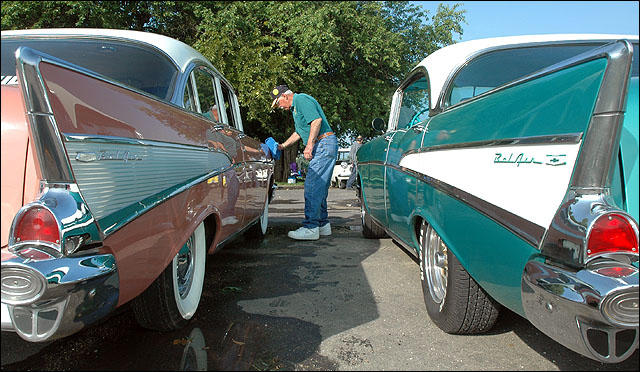 Bill Bonce, Linwood, polishes up a friend's 1957 Chevy at the 33rd Douglas County Antique Car Show at the Douglas County Fairgrounds.