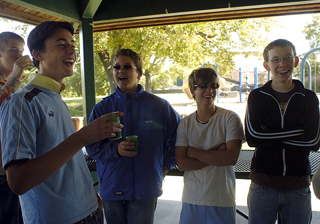 Exchange students Mattias Petersen, 16, front left, and Gotz Schnackenberg, 17, second from left, share a laugh with Free State High School students Dallas Schmitendorf, 18, second from the right, and Brendan Desetti, 17, far right, during a send-off lunch for 13 exchange students from Eutin, Germany. The Saturday afternoon event at Centennial Park included refreshments and volleyball. The students from Eutin spent several weeks in Lawrence.