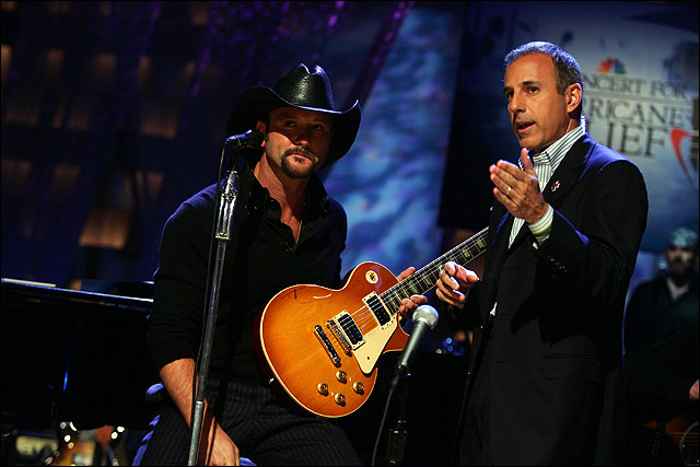 NBC News' Matt Lauer, host of the celebrity telethon for Hurricane Katrina disaster relief, introduces Tim McGraw during the telethon. Some 18 presenters performed musical numbers or gave information on the tragedy's huge scope.