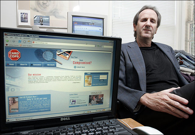 Dan Clements, CEO of Cardcops.com, displays his company's Web site from his office in Los Angeles. CardCops monitors Internet chat rooms and other hacker communications for stolen credit card numbers, then notifies merchants and consumers to block bad purchases.