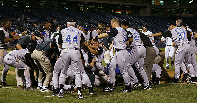 Kansas City Royals players and coaches move to aid first-base coach Tom Gamboa after two bare-chested fans ran onto the field and attacked him Sept. 19, 2002, at U.S. Cellular Field in Chicago. Three years after the attack, Gamboa is manager of the Double-A Arkansas Travelers.