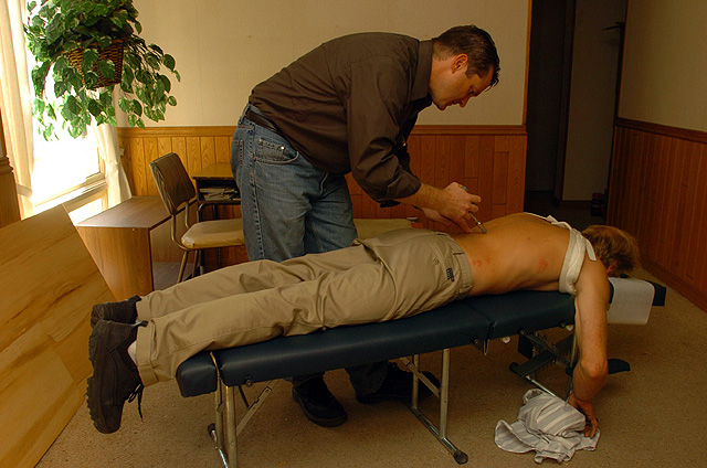 Richard Gwin/Journal World-Photo Lawrence Chiropractor Phillip Hart, donated his time Wednesday afternoon at the Community Drop In Center, as he did some free adjustments to anyone who needed one.