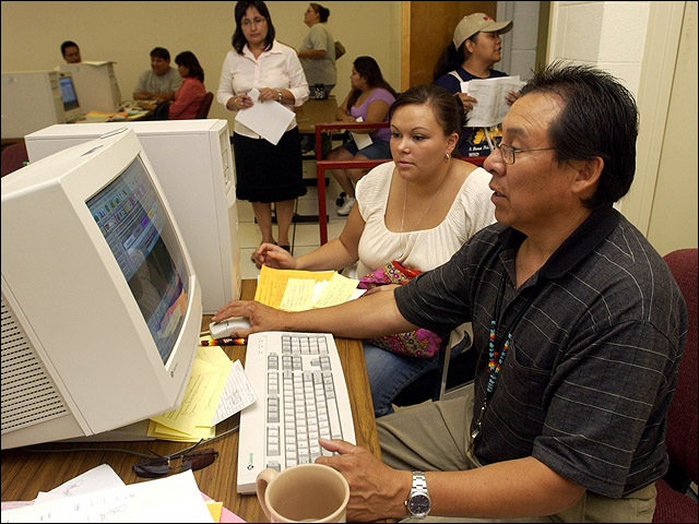 Haskell Indian Nations University registrar Manny King, right, works with sophomore Leah Elliott, Pawhuska, Okla., to format her schedule of classes for the approaching semester during enrollment Aug. 22 at Navarre Hall. Event dates have been announced for the 2005-2006 calendar.