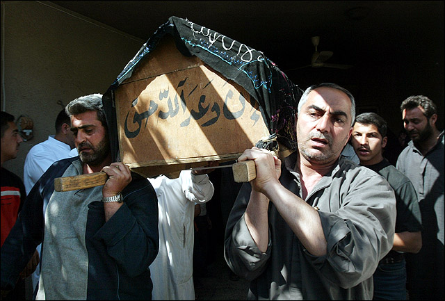 Iraqi men carry the coffin of a 4-year-old girl who was killed when a car bomb exploded near the Shiite Ali Basha mosque Friday March 31, 2006 in Baghdad's eastern Kryaat neighborhood. A mortar round slammed into a street in northeastern Baghdad Friday, as Iraqi leaders, trying to form a national unity government, resumed talks.
