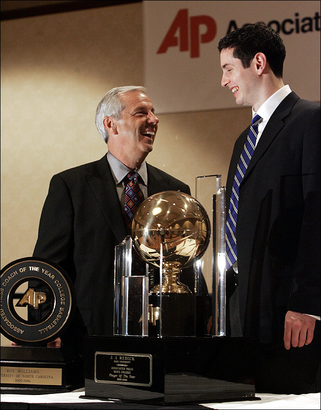 Roy Williams, the coach of the Tar Heels, and J.J. Redick, the star guard of the Blue Devils, had good things to say about each other Friday when they received awards from the Associated Press as the national coach and player of the year.