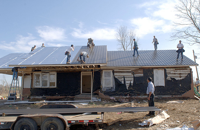 Mennonites from the Gibson County, Tenn., and Montecello, Ky., communities help rebuild the house of fellow Mennonite James Yoder in Rutherford, Tenn. The group of Mennonites from Kentucky drove all night to get to Tennessee to help rebuild homes damaged or destroyed in Sunday's tornadoes.