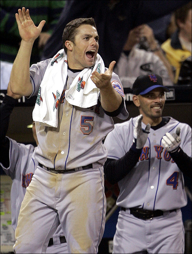 New York Mets' David Wright (5) and Chris Woodward lead the team out of the dugout in celebration as the Mets' Julio Franco's two-run home run gave the Mets a 3-2 lead in the eighth inning against the San Diego Padres, in this April 20, 2006 file photo in San Diego. With uncommon poise, perspective and get-dirty enthusiasm, Wright is becoming one of baseball's toughest outs and a Big Apple icon all at once.