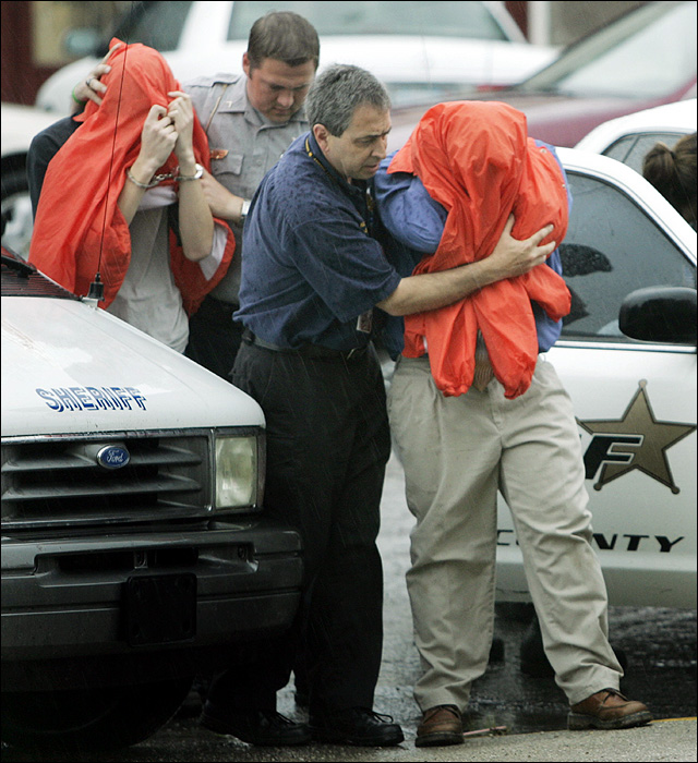 Two of five Riverton High School students are led to a hearing at the Cherokee County Courthouse in Columbus, Kan., Monday, April 24, 2006. They are suspects in a school shooting plot.