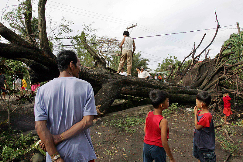 Residents watch as workers clear fallen trees from a road today in Candelaria, Quezon province, after super typhoon Durian lashed the Philippines' main island of Luzon in central and northeastern Philippines overnight, killing more than 100 people.