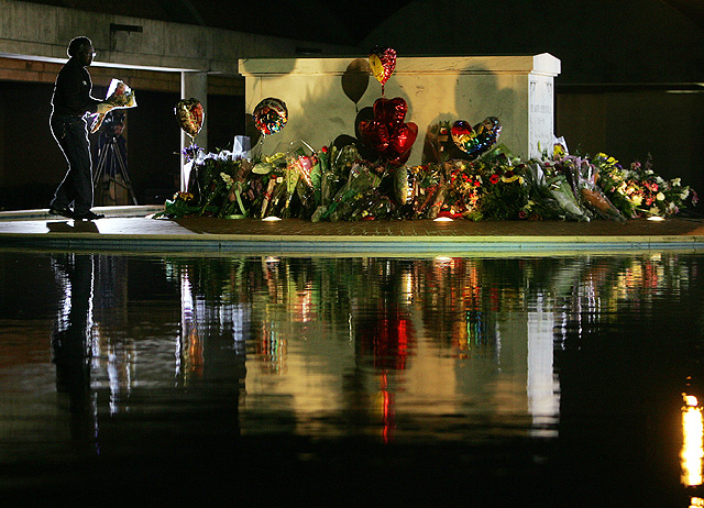 King Center employee Elijah Copeland places flowers around the tomb of Martin Luther King Jr. in Atlanta. The flowers were left in honor of King's widow, Coretta Scott King, who died in her sleep Tuesday at age 78.