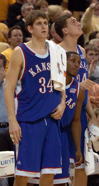 Kansas players Christian Moody, Jeff Hawkins and Sasha Kaun stand on the sidelines in dejection as Missouri solidifies their victory of 89-86 in Columbia, Mo.
