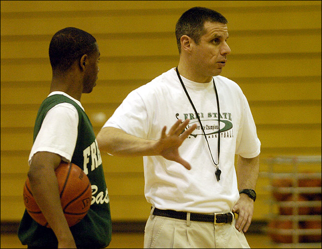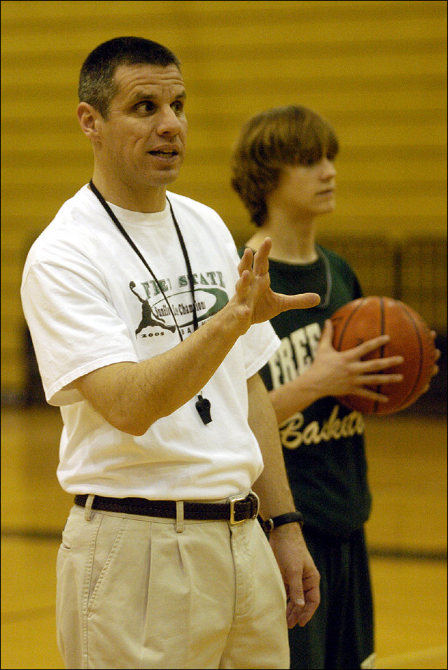 Free State High Boy's Basketball Coach Chuck Law works to get a point across during practice. Law became the Firebirds' interim coach last fall when longtime coach Jack Schreiner resigned.