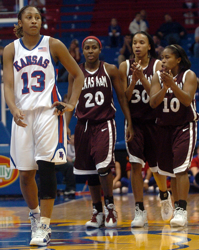 Kansas sophomore forward Taylor McIntosh (13) walks past Texas A&M players Erica Roy, left, Tamea Scales, center, and A'Quonesia Franklin as the Aggies applaud after KU missed two technical foul shots late in the second half of A&M's 78-64 victory. KU lost Sunday in Allen Fieldhouse.