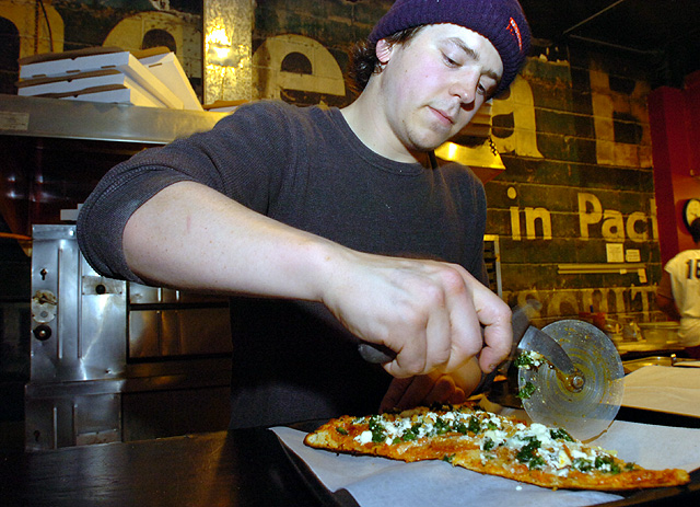James Roberts cuts up a slice of pizza for a customer Friday evening at Papa Keno's, 1035 Mass. The pizzeria is featured in a new book, Everybody
