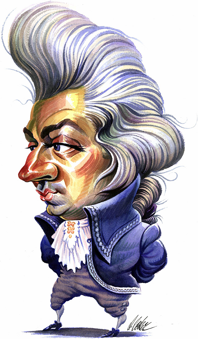 300 dpi 4 col. x 14.75 inches/220x375 mm/749x1274 pixels Don Coker color illustration of Wolfgang Amadeus Mozart (1756-1791). Columbus Ledger-Enquirer 2001