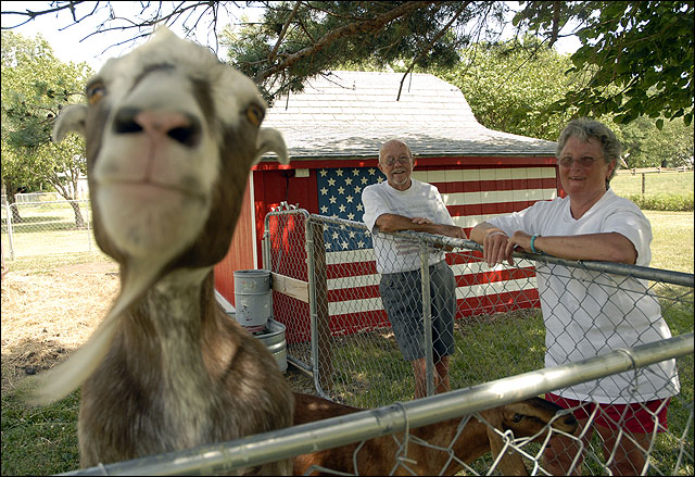 Sugar, a billy goat, jumps up to inspect a camera, as Marvin and Sheila McCurdy look on from the right. Sugar and his roommate, Clyde, stay in the barn, painted as a flag, at the McCurdy's home in northwest Lawrence.
