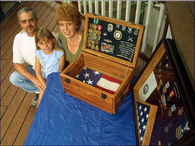 Marty and Tina Trumble, who married while they were in the Navy, keep two flags with special meaning at their house - the one at left was flown at City Hall to honor Marty's retirement, and the one at right was flown on the island of Diego Garcia to honor Tina's retirement. The Lawrence couple are pictured with their 8-year-old daughter, Katie.