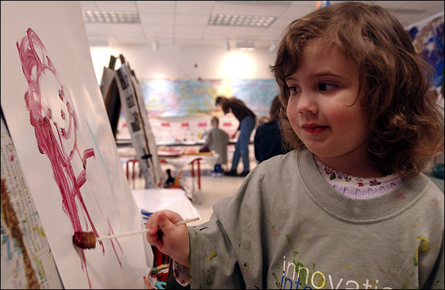 Nicole Spencer, then 3, paints during preschool at the Lawrence Arts Center in this March 2005 file photo. Decorating professional Deborah Wiener says if parents display children's creations smartly, they may never have to buy artwork or posters again.