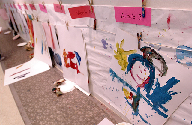 Children's work from the Lawrence Arts Center preschool class is hung on the wall to dry. Simple efforts can help display and preserve a child's artwork long after it's decorated the refrigerator for a spell.