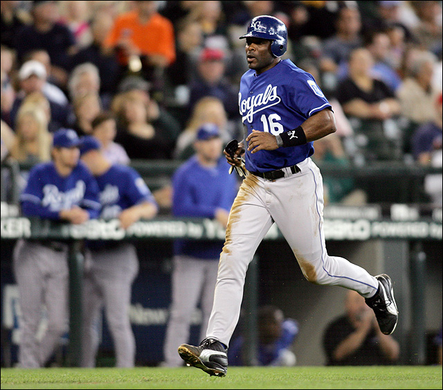 Kansas City's Reggie Sanders scores after stealing third against the Seattle Mariners. Sanders advanced to home plate on a throwing error by Seattle catcher Kenji Johjima in the fifth inning of a 9-4 Royals victory.