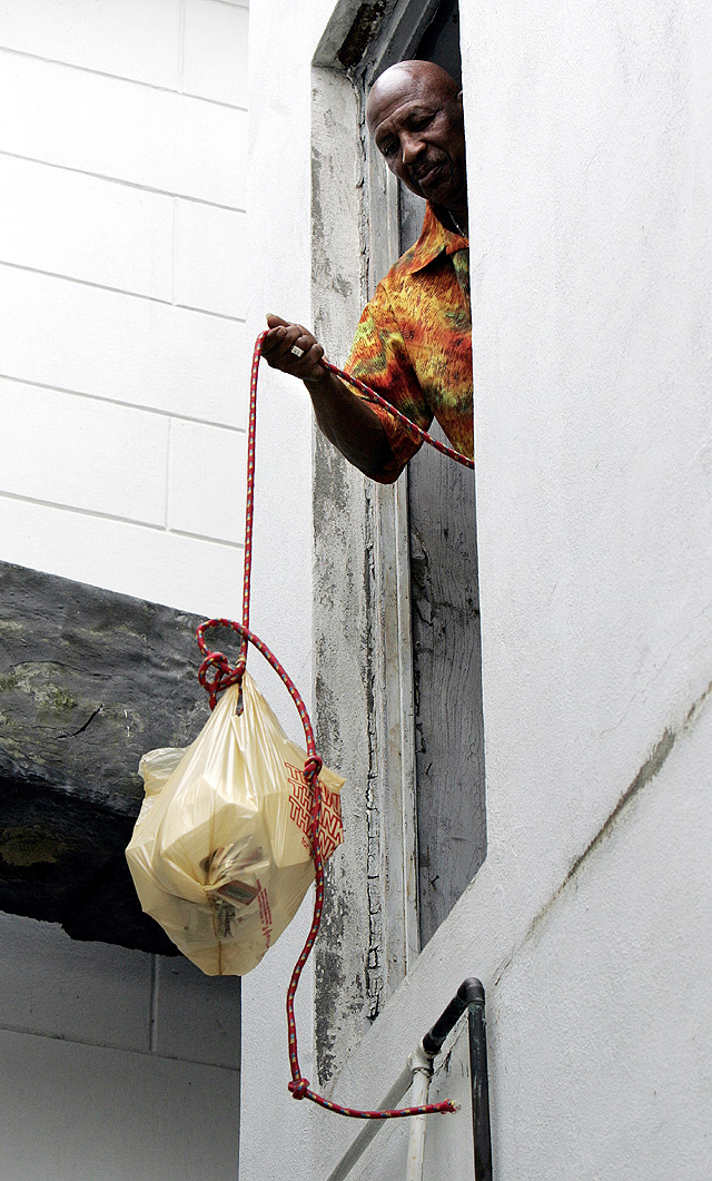 John Powell uses a rope to raise a bag of food into the rectory of St. Augustine Church in New Orleans. The New Orleans Archdiocese has closed the parish but will keep the church open, and Powell and others have taken up residence in the rectory in protest.