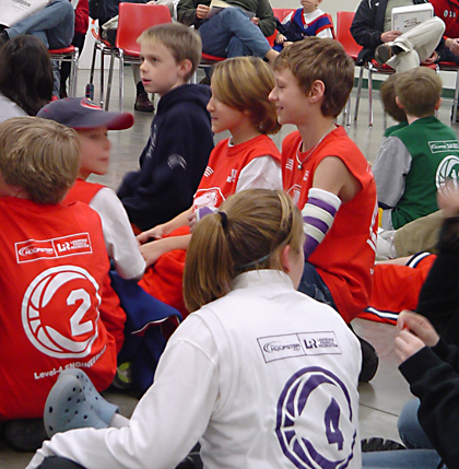 The fourth-and fifth-grade Mustangs talk before the start of the Hoopster Banquet at 4-H Fairgrounds.