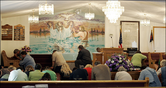 Members of the Cloverfork Missionary Baptist church in Holmes Mill, Ky., gather together in prayer for the five miners killed in an underground explosion Saturday. Though none of the miners were members of the church, the small community is tight-knit and most have connections to the coal industry. The church is less than a mile from the entrance to the mine where the accident occurred.