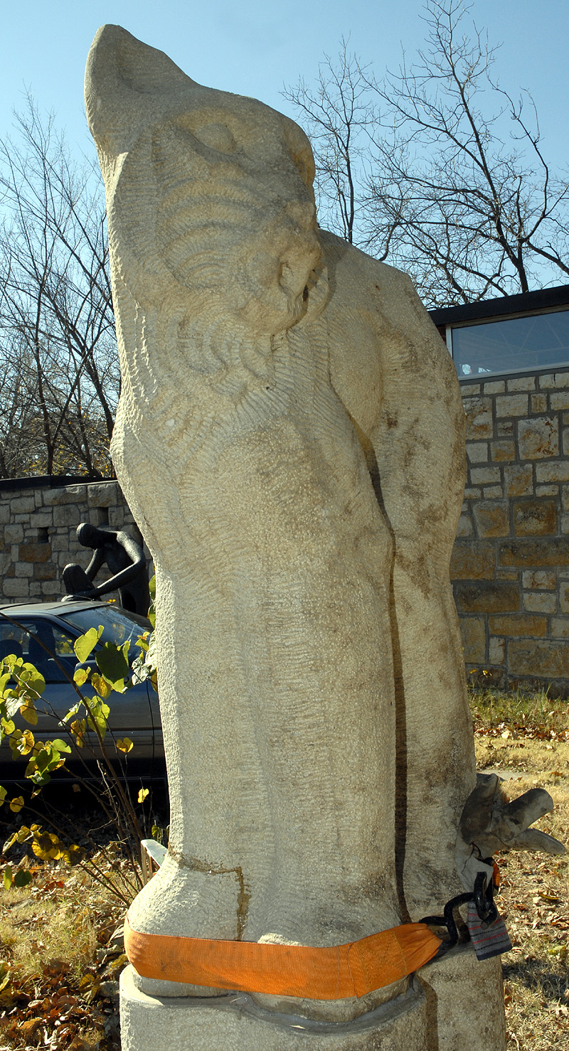A limestone cat sculpture by Kansas University professor emeritus Elden Tefft has been re-erected at 1315 Naismith Drive. A KU student group put up the fallen statue Saturday.