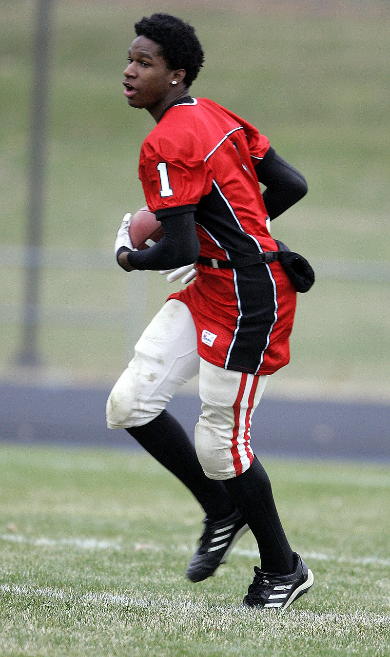 Troy Williams runs with the ball during football practice. His family was displaced to Auburn, Neb., after Hurricane Katrina.