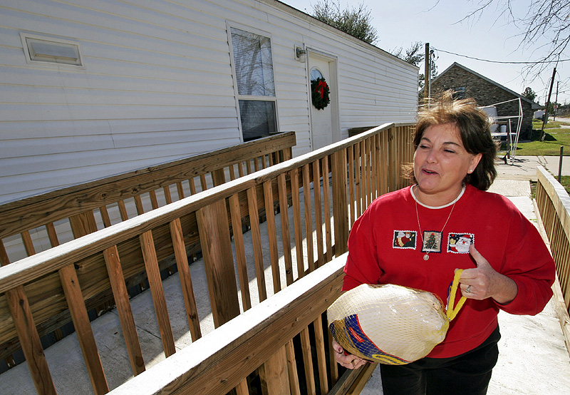 Hurricane Katrina victim Nancy Prattini carries a turkey into her FEMA mobile home in Chalmette, La. The number of Katrina victims who will be spending the holiday in FEMA trailers this year is roughly three times greater than it was last year.