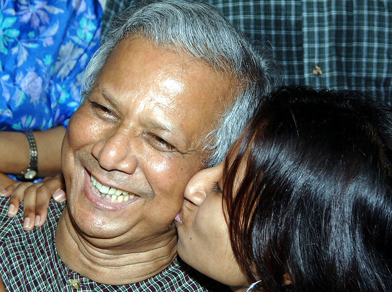 Nobel Peace Prize winner Muhammad Yunus gets a kiss on the cheek from his daughter, Dina Yunus, in Dhaka, Bangladesh. Muhammad Yunus and his Grameen Bank received the Nobel Peace Prize Friday for their work in advancing economic and social opportunities for the poor that has helped millions lift themselves from crushing poverty.