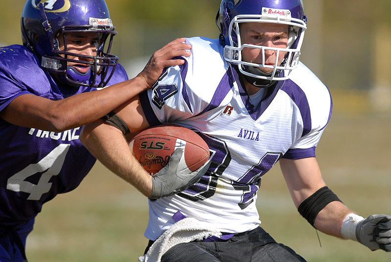 Haskell's Micah Swimmer tries to slow down Avila's Doug Wendell during the first half. Haskell lost to Avila 21-13 Saturday afternoon at Haskell.