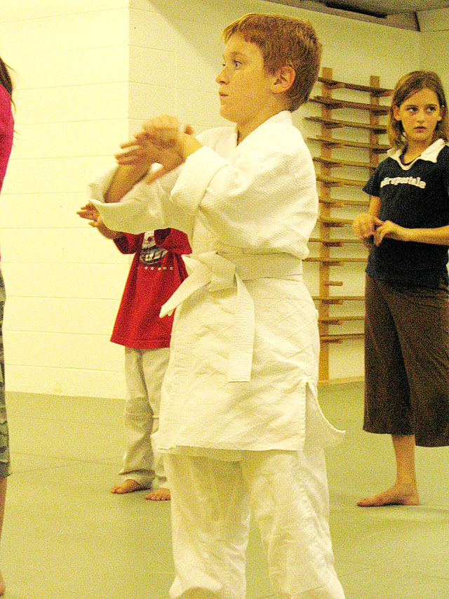 Another real-life lesson the kids learn in the Ki Aikido class is how to fall safely by adjusting their weight and learning a series of rolls.