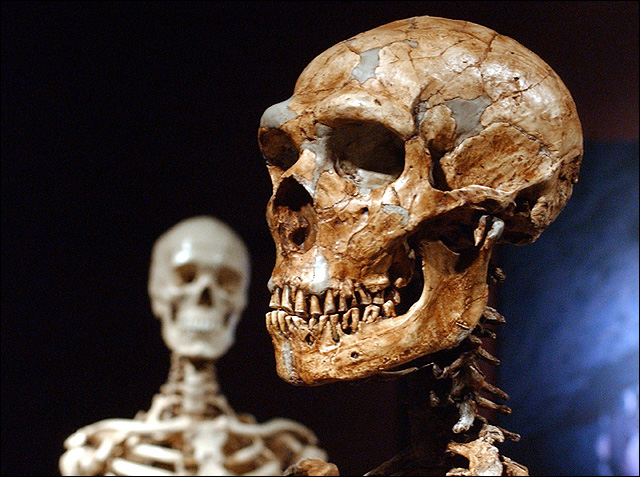 A reconstructed Neanderthal skeleton, right, and a modern human version of a skeleton are on display at the Museum of Natural History in New York. A new study says evidence in Gibraltar indicates that Neanderthals were still alive at least 2,000 years later than had been previously established.