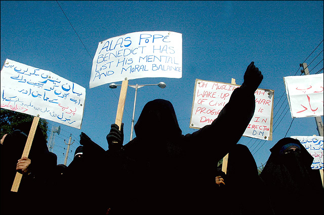 Black-veiled Muslim women activists of Dukhtaran-e-Millat, or Daughters of the Community, protest the pope Saturday in Srinagar, India. Police detained nearly two dozen Muslim protesters Saturday as demonstrations against Pope Benedict XVI's remarks on Islam continued for the second straight day in the Indian portion of Kashmir.