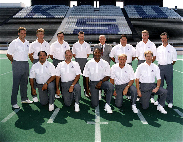 Former Kansas State coach Bill Snyder turned around a dismal Wildcat football program in the 1990s with the help of solid up-and-coming assistants now making a name for themselves in the college game. This photo, taken sometime in the early 1990s, shows (front row, from left): John Latina, Nick Quartaro, Kevin Ramsey, Del Miller, Bruce Van De Velde. (back row, from left): Dana Dimel, Jim Leavitt, Jerry Palmieri, Bob Stoops, Bill Snyder, Mark Mangino, Mike Stoops and Bob Cope.