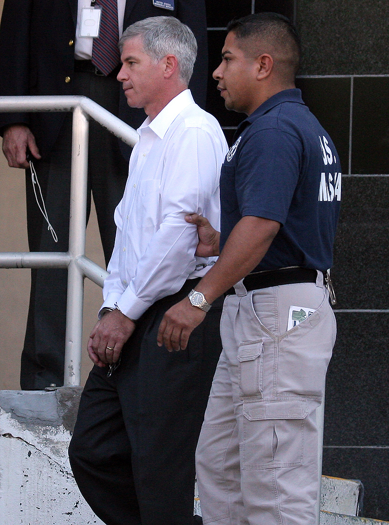 Former Enron executive Andrew Fastow, left, in chains, leaves federal court Tuesday in Houston, after being sentenced to six years in prison for his role in the energy company's collapse.