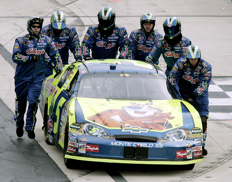 Kyle Busch's crew pushes his car down pit road after he blew an engine during the Dover 400. The mishap at Dover Speedway last weekend all but guaranteed Busch won't win the Nextel Cup.