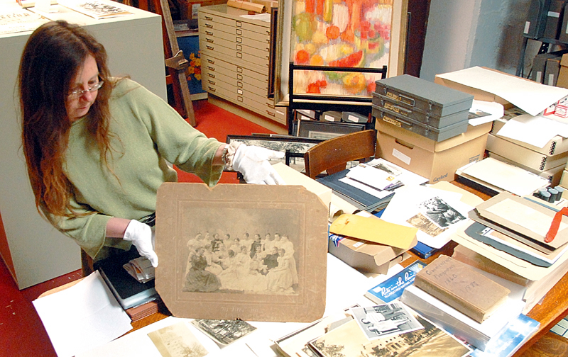 Brenda Day, Baker museum director, displays a photo of students who would become Delta Delta Delta sorority members.