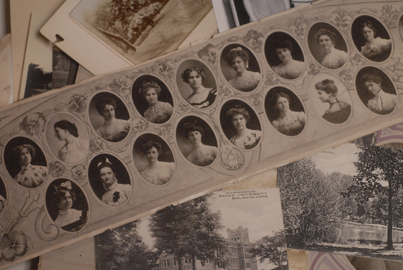 Photos of Former Baker University classmates are shown among other memorabilia from the school's past 150 years. Baker was chartered Feb. 12, 1858, and is now the oldest university in Kansas.