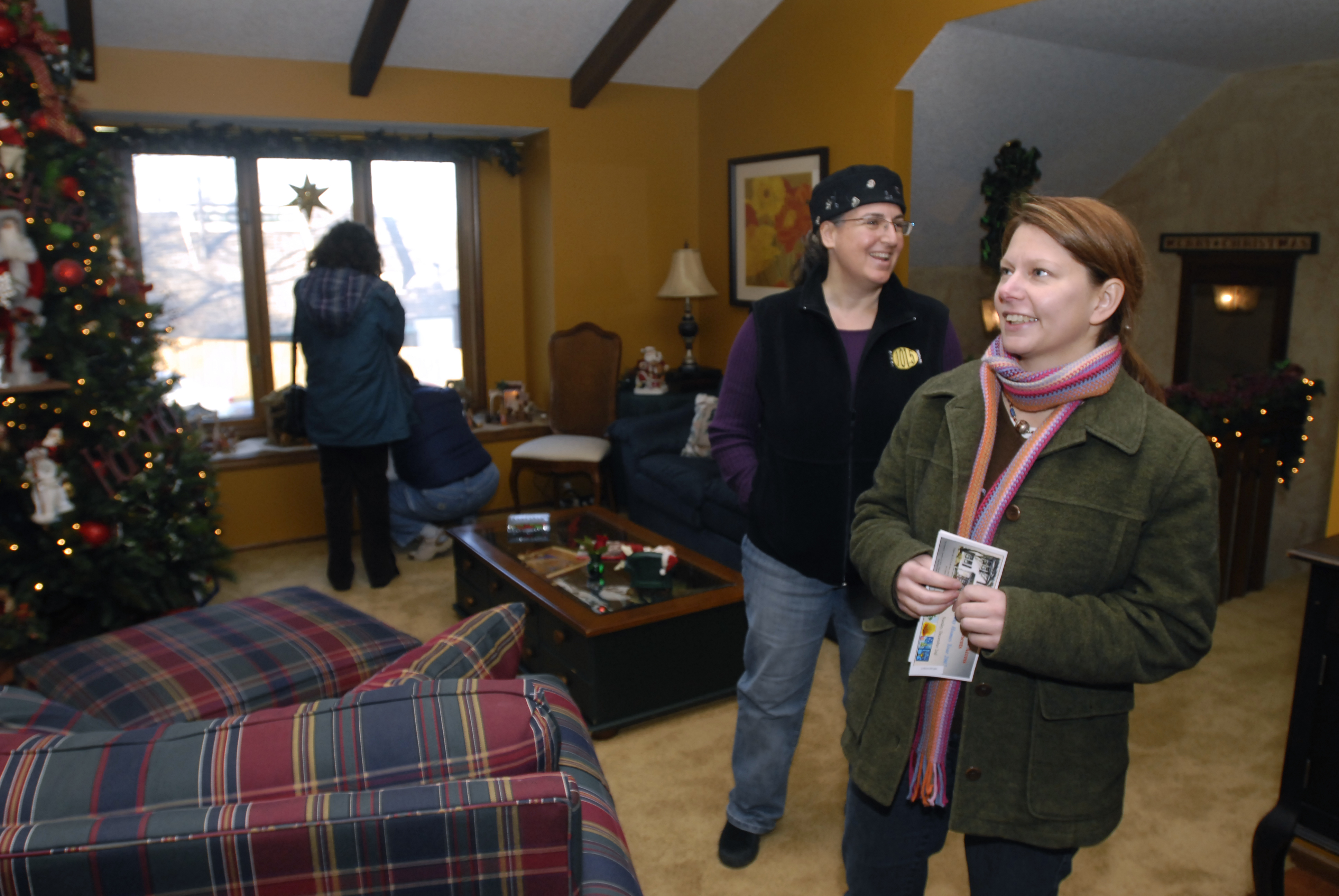 Shala Stevenson, center, and Bridget Patti, both of Lawrence, take in the Rev. Mick Mulvany's home, 3209 Harvard Road, during the third annual Holiday Homes Tour. The tour is a fundraiser for Health Care Access Clinic.