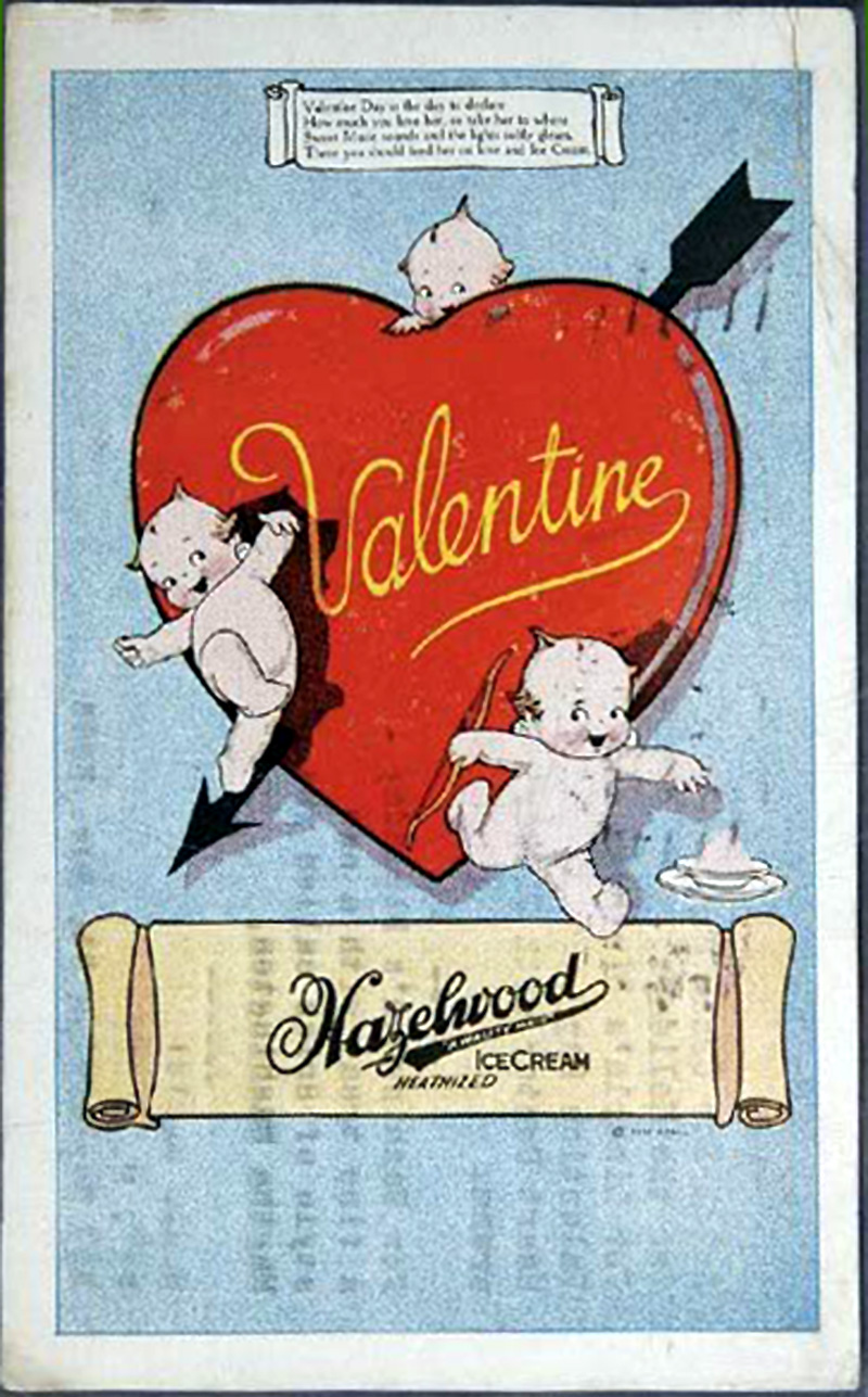 The design on a valentine can help date it. This postcard pictures the Rose O'Neill Kewpies, popular in the early 20th century. It is worth about 00.