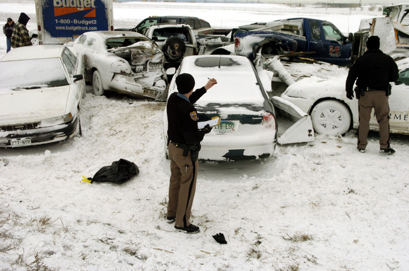 Aaron Limburg, of the Colorado State Patrol, takes notes at the scene where more than two dozen cars collided in whiteout conditions on Interstate 70 early Saturday in Aurora, Colo. Blowing snow reduced visibility to almost nothing when the accident happened. No major injuries have been reported in the pileup.