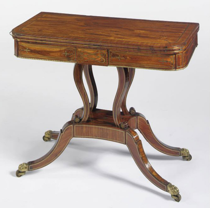 This Regency brass-inlaid tulipwood game table was made around 1810. The closed table takes up little space against a wall. The top flips open to make a square surface just the right size for four chairs. The table is worth several thousand dollars.