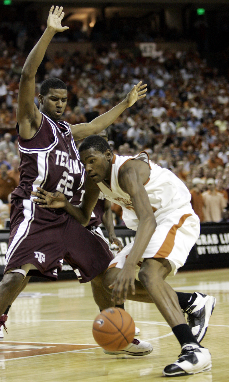 Texas forward Kevin Durant, right, drives against Texas A&M guard Dominique Kirk, left, on Wednesday. Durant is drawing comparisons to some of college basketball's all-time greats.