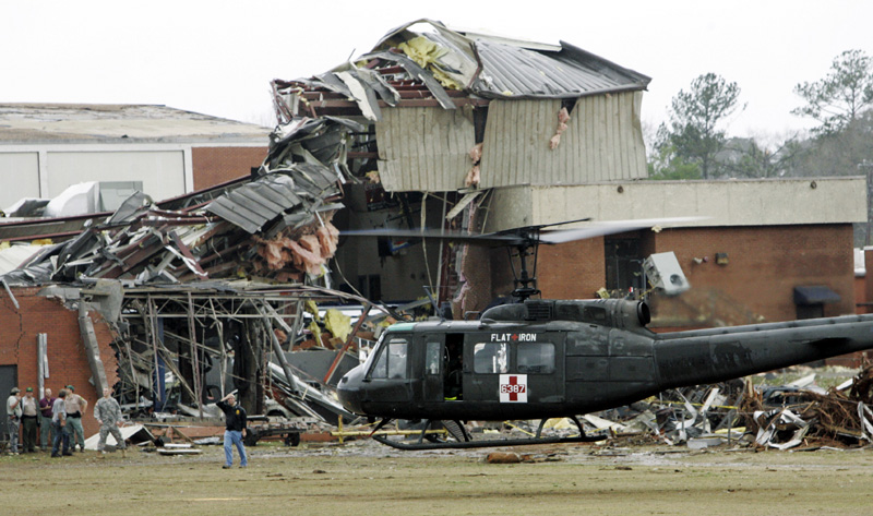 A U.S. Military helicopter evacuates an injured person from Enterprise High School in Enterprise, Ala. A tornado severely damaged the school Thursday, killing at least five people and injuring many more.