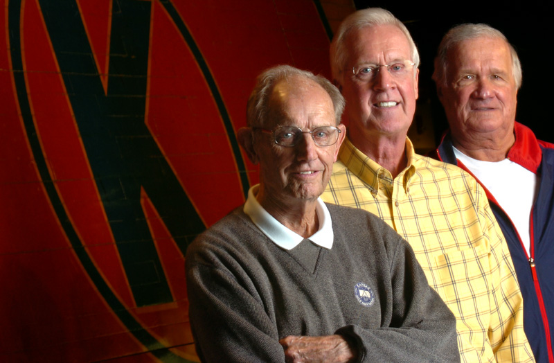 Jerry Waugh, left, an assistant coach in 1957, Monte Johnson, center, a reserve in 1957, and big man Ron Loneski vividly - and somewhat painfully - remember KU's loss to North Carolina in the national championship game