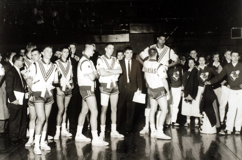 A dejected flock of Jayhawks mill about after their triple-overtime loss to North Carolina in the 1957 national championship game.